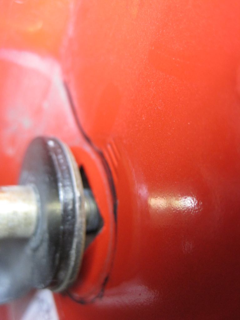 Also notice the black outline--this was recommended to me to outline around the striker to be able to line it back up correctly (so the door closes the same after repair. I used dry erase marker. Grease pencil would work better.